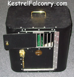 Another option besides a normal falconry hood is a Giant Hood. A giant hood is a large box/carrying case to transport the bird. They are especially great for traveling in a car and for bringing a bird into places they aren't supposed to go...like a hotel room. The Giant Hood I use is made by Forest Hawk. Forest Hawk makes these GREAT giant hoods in many colors, shapes and sizes. It comes with a perch inside and has a lock for added security. They are very sturdy and I have stood on top of mine with zero problems. These are expensive but the attention to detail is amazing and well thought out. These are the best giant hoods money can buy! You can reach them at ForestHawkFalconry@Yahoo.com *Note* This is not a Mews. This is used only to transport your bird. Kestrels need alot more space for day to day life. This is NOT a "falcons home"....understand?