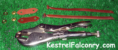 Keep them thin and light. When you first become a falconer don't feel pressure to make your own. Buying Jesses and Anklets saves time and you know you are getting a quality product. Anklets and Jesses are made from Kangaroo skin. Find a good supplier who will make ones specifically for Kestrels. Kestrel grommet size is 00. You will also need grommet pliers to set the grommets in the anklet leather. The bird will be flying while wearing the anklets so they need to be light. The total weight of the Anklets and Grommets that I use is 2.3 grams (not including jesses). I recently started making my own jesses and anklets. Kangaroo leather is expensive so measure twice cut once.