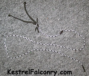The Leash connects the jesses to the perch or to your glove. There are many ways to do this by either using a braided leash and falconers knot or by using small clips. They both work well, just make sure that you don't have a heavy leash hanging on your kestrels legs. This will cause wear in one spot and lead to leg damage and/or bumble foot. Keep it light weight! There are many falconers that make awesome braided jesses. Making your own can be very time consuming and the final product probably won't be as good as if you bought it from a falconer that has been making these for many years. Plus you are supporting that falconer by purchasing their falconry gear.