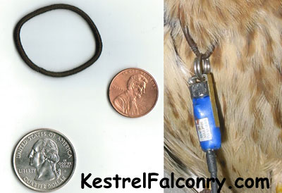 There are different ways to mount a transmitter to your bird. The different methods are Backpack, Foot Mount, Neck Mount. I use the neck mount method. It is lighter than the backpack method and can be taken on and off the bird easily. Also, with the neck mount method if the bird gets caught in a branch or bush then they can pull out of the mount. The neck mount method is a little hair tie the size is shown in the picture and a small stainless split ring also shown. The picture above shows how a kestrel wears the neck mount. They preen the band into their feathers and can even cast through the neck mount. The total weight of my transmitter plus hair band plus stainless split ring is 2.9 grams. The transmitter attaches to the bird only when I go hunting or am free flying the bird to the lure.