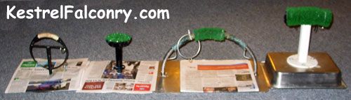 Birds like to perch, that is what birds do, so it is important to understand what the bird is looking for in a perch and what you are looking for in a perch. Perches come in all sizes and shapes. The picture above shows common types. Starting on the left of the picture is: Ring Perch, Block Perch, Bow Perch, T-Perch. You want a perch that you can clean easily and/or easily change surface material where the birds feet make contact. Kestrel legs can be damaged easily if you don't take certain precautions. Traditionally, Falcons perch on a Falconry Block and Hawks perch on a Bow perch but Kestrels can use both without problems. I have a number of different perches, one for the car, one for general use, one for training on location. Remember, it is easy to damage Kestrel legs so don't have a long and heavy leash hanging from their legs.